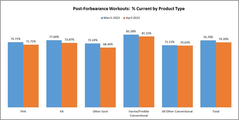 - Total completed loan workouts from 2020 and onward (repayment plans, loan deferrals/partial claims, loan modifications) that were current as a percent of total completed workouts decreased to 74.39% in April from 76.70% the previous month.