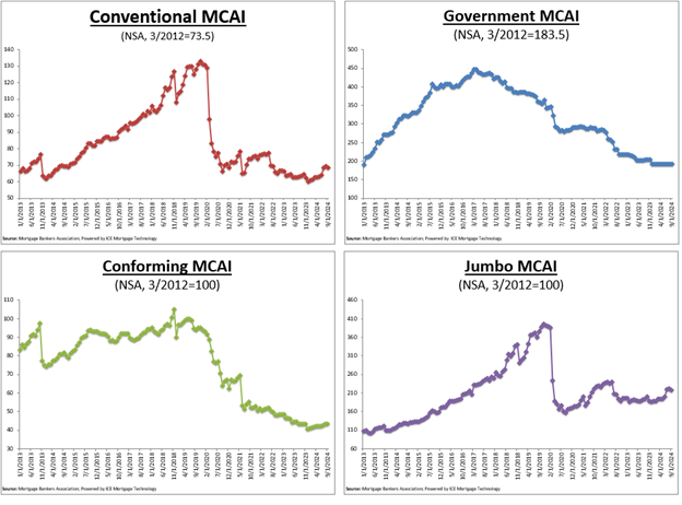 The Conforming and Jumbo indices have the same “base levels” as the Total MCAI (March 2012=100), while the Conventional and Government indices have adjusted “base levels” in March 2012. MBA calibrated the Conventional and Government indices to better represent where each index might fall in March 2012 (the “base period”) relative to the Total=100 benchmark.