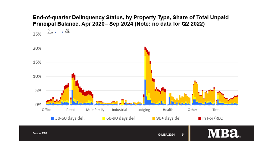 "Delinquency rates for commercial mortgages backed by office properties continued to increase during the third quarter but declined for loans backed by lodging, retail and industrial properties,” said Jamie Woodwell, MBA's Head of Commercial Real Estate Research. “The commercial mortgage market is large and diverse, covering a range of property types, sizes and ages, geographic markets and submarkets, borrower types, vintages and more. Each of those differences is affecting loan performance, some to the good and some to the bad.”