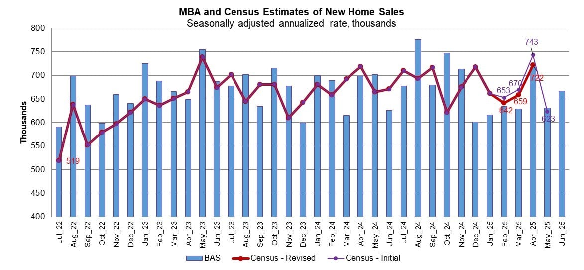 MBA estimates new single-family home sales, which has consistently been a leading indicator of the U.S. Census Bureau’s New Residential Sales report, is that new single-family home sales were running at a seasonally adjusted annual rate of 667,000 units in June 2025. The new home sales estimate is derived using mortgage application information from the BAS, as well as assumptions regarding market coverage and other factors.