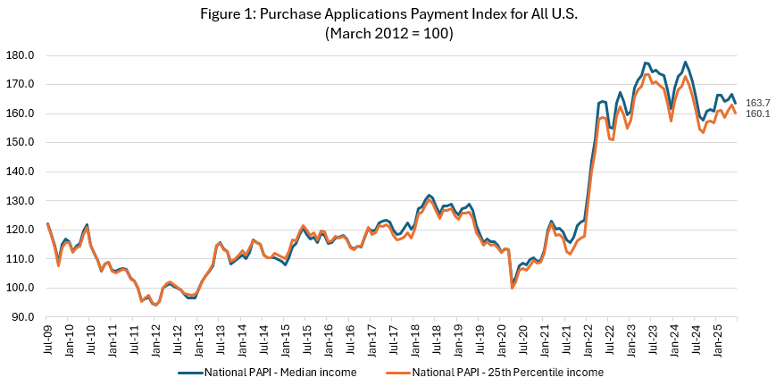WASHINGTON, D.C. (July 31, 2025) – Homebuyer affordability improved in June, with the national median payment applied for by purchase applicants decreasing to $2,172 from $2,211 in May. This is according to the Mortgage Bankers Association's (MBA) Purchase Applications Payment Index (PAPI), which measures how new monthly mortgage payments vary across time – relative to income – using data from MBA’s Weekly Applications Survey (WAS).