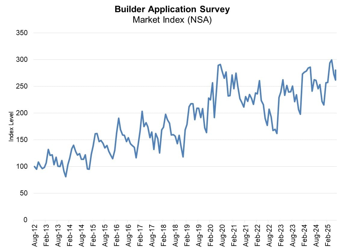 WASHINGTON, D.C. (August 18, 2025) – The Mortgage Bankers Association (MBA) Builder Application Survey (BAS) data for July 2025 shows mortgage applications for new home purchases increased 6.8 percent compared from a year ago. Compared to June 2025, applications increased by 7 percent. This change does not include any adjustment for typical seasonal patterns.