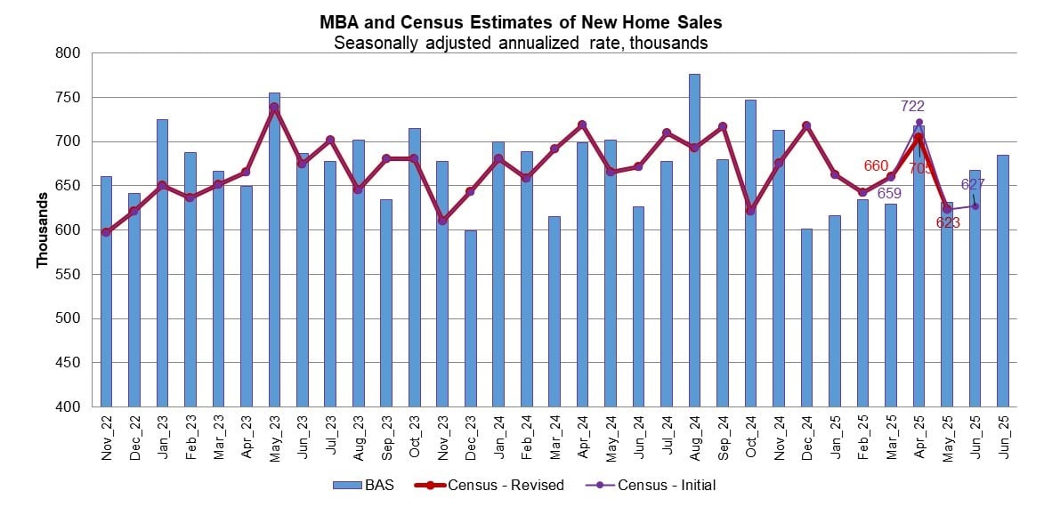 MBA estimates new single-family home sales, which has consistently been a leading indicator of the U.S. Census Bureau’s New Residential Sales report, is that new single-family home sales were running at a seasonally adjusted annual rate of 685,000 units in July 2025. The new home sales estimate is derived using mortgage application information from the BAS, as well as assumptions regarding market coverage and other factors.