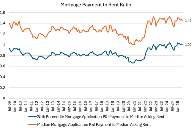 MBA’s national mortgage payment to rent ratio (MPRR) decreased from 1.48 at the end of the first quarter (March 2025) to 1.45 at the end of the second quarter (June 2025), meaning mortgage payments for home purchases have decreased relative to rents. The Census Bureau’s HVS national median asking rent in the second-quarter 2025 increased to $1,494 ($1,468 in first-quarter 2025). The 25th percentile mortgage application payment to median asking rent ratio decreased to 1.00 in June (1.02 in March 2025).