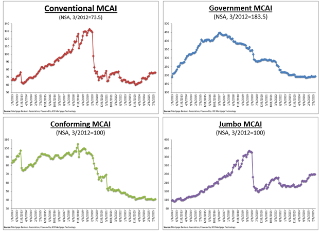 The MCAI rose by 0.4 percent to 104.4 in September. The Conventional MCAI increased 0.1 percent, while the Government MCAI increased by 0.8 percent. Of the component indices of the Conventional MCAI, the Jumbo MCAI decreased by 0.1 percent, and the Conforming MCAI rose by 0.7 percent.
