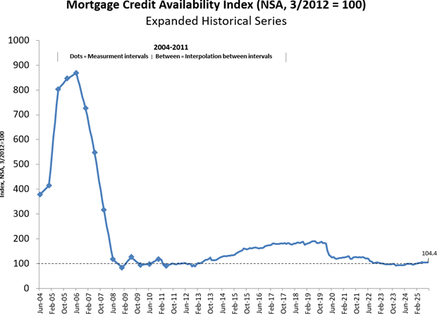 The Total MCAI has an expanded historical series that gives perspective on credit availability going back approximately 10-years (expanded historical series does not include Conventional, Government, Conforming, or Jumbo MCAI). The expanded historical series covers 2004 through 2010 and was created to provide historical context to the current series by showing how credit availability has changed over the last 10 years – including the housing crisis and ensuing recession. Data prior to March 31, 2011 was generated using less frequent and less complete data measured at 6-month intervals and interpolated in the months between for charting purposes. Methodology on the expanded historical series from 2004 to 2010 has not been updated.