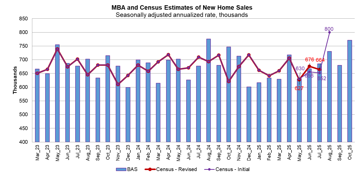 MBA estimates new single-family home sales, which has consistently been a leading indicator of the U.S. Census Bureau’s New Residential Sales report, is that new single-family home sales were running at a seasonally adjusted annual rate of 771,000 units in October 2025. The new home sales estimate is derived using mortgage application information from the BAS, as well as assumptions regarding market coverage and other factors.