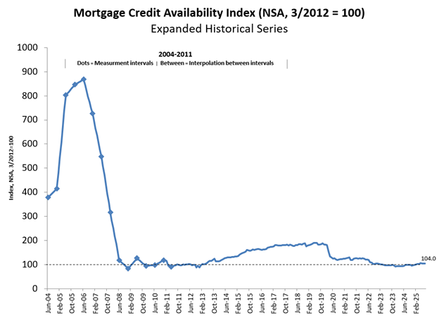 The Total MCAI has an expanded historical series that gives perspective on credit availability going back approximately 10-years (expanded historical series does not include Conventional, Government, Conforming, or Jumbo MCAI). The expanded historical series covers 2004 through 2010 and was created to provide historical context to the current series by showing how credit availability has changed over the last 10 years – including the housing crisis and ensuing recession. Data prior to March 31, 2011 was generated using less frequent and less complete data measured at 6-month intervals and interpolated in the months between for charting purposes. Methodology on the expanded historical series from 2004 to 2010 has not been updated.